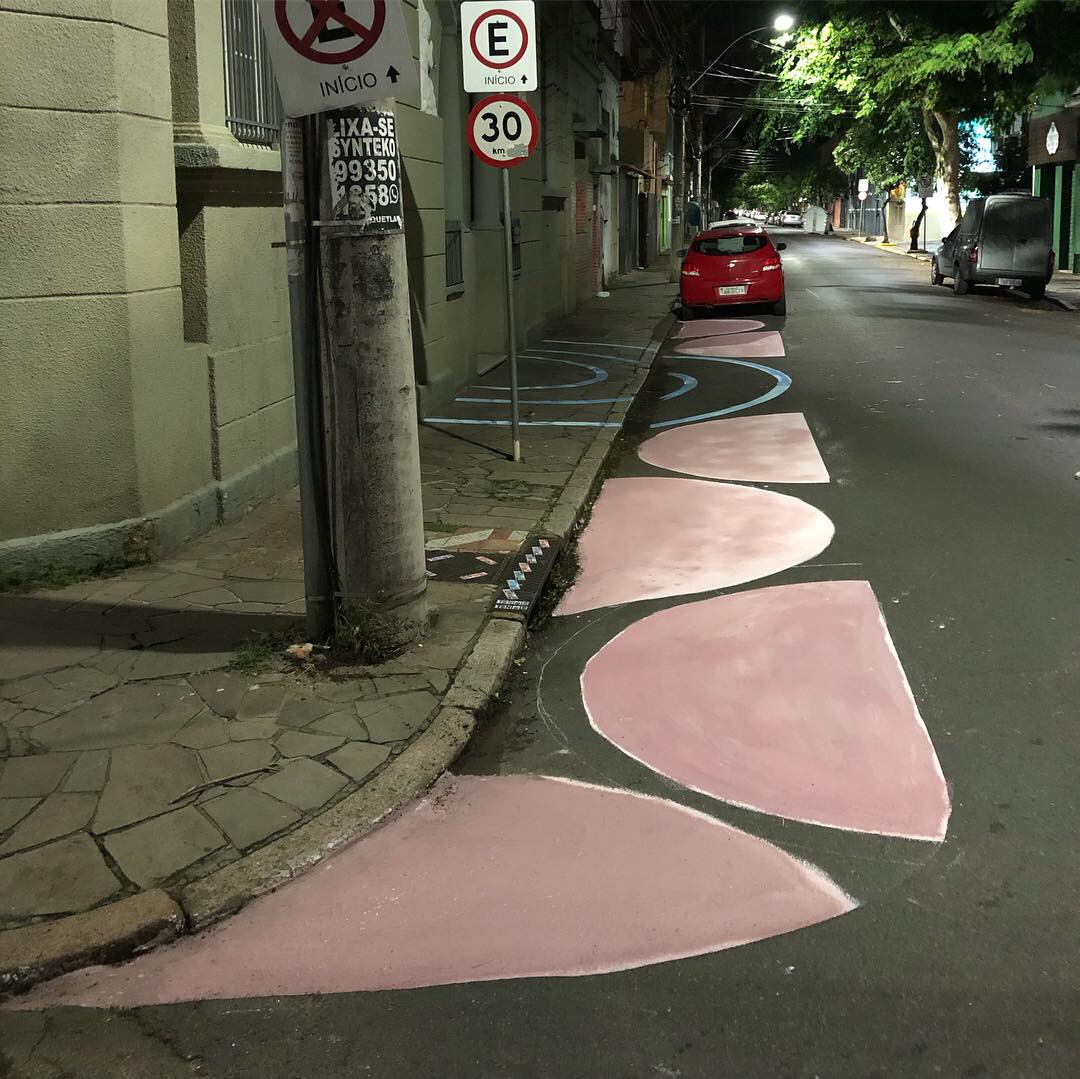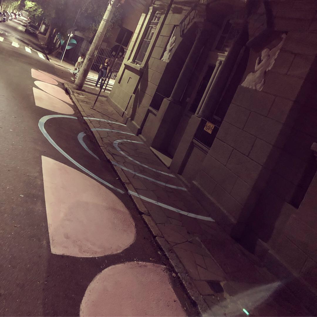 Fizemos uma ação de pintura na madrugada visando chamar a atenção para a questão do tráfego perto das esclas do bairro Centro Histórico de Porto Alegre.